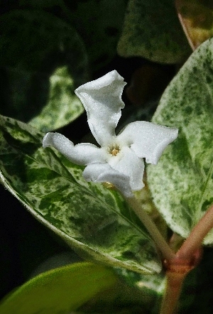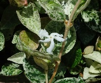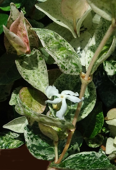 ![]() | 東京都都市緑化植物園 にて | テイカカズラ の園芸種で、新芽が濃いピンク、次第に白に変り、さらに進むと緑に白の斑入りとなり、最後は緑一色になる。![]() ![]() |